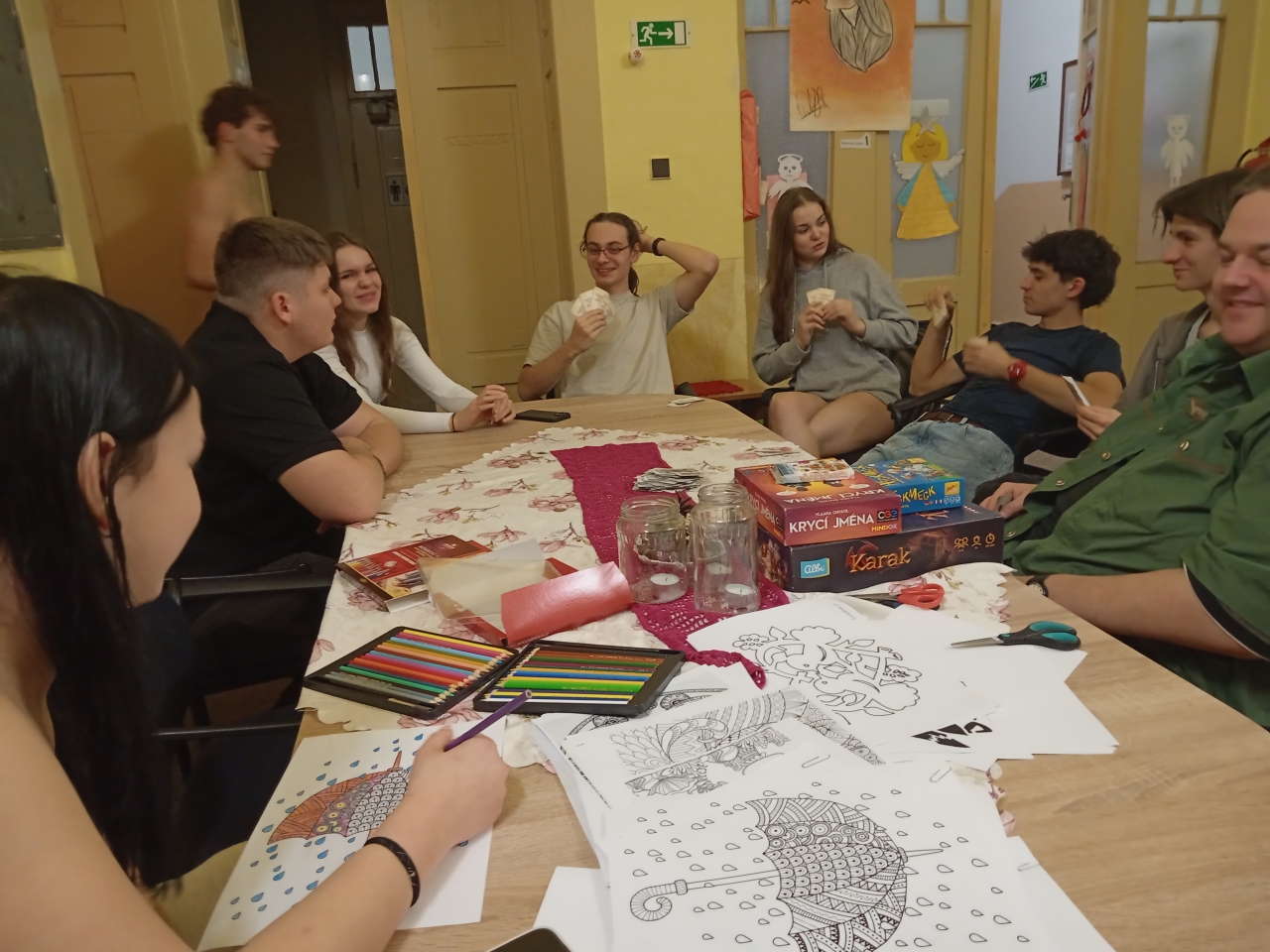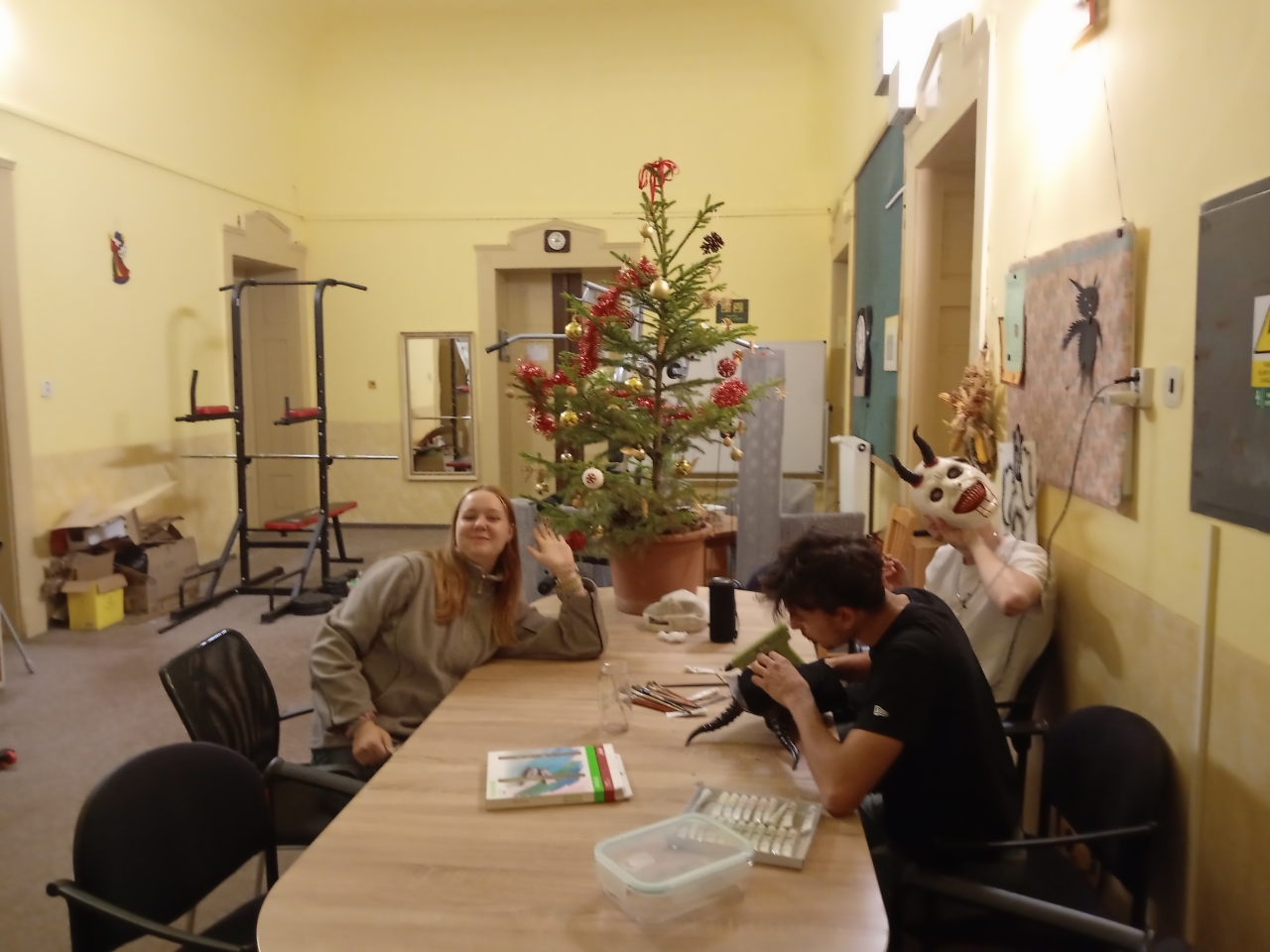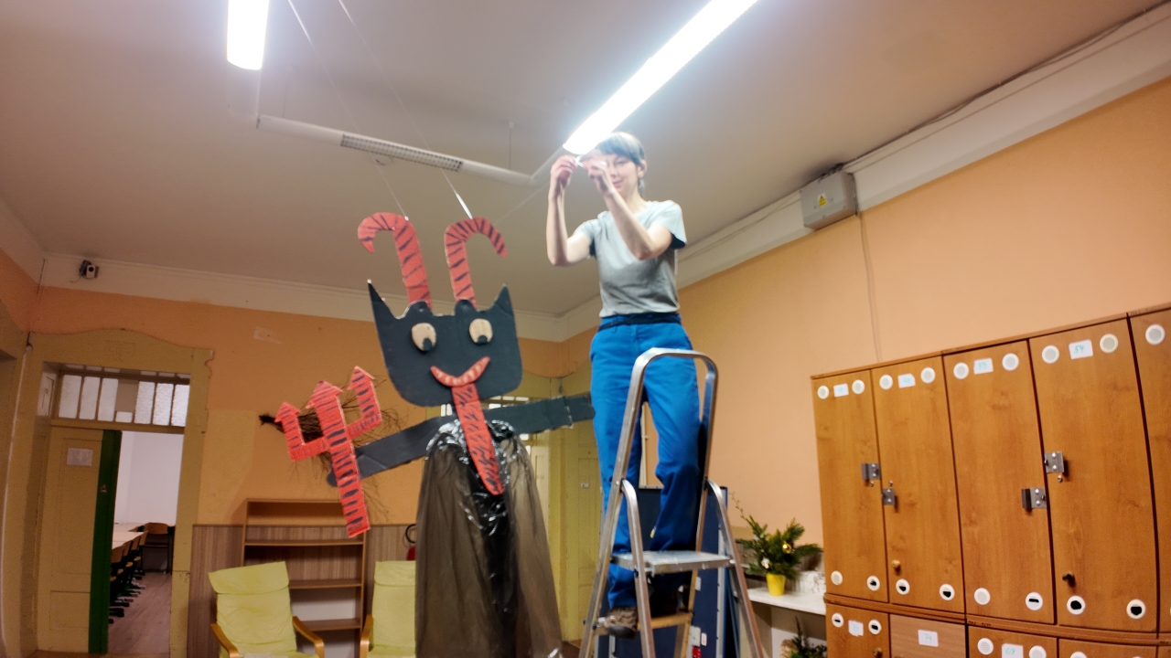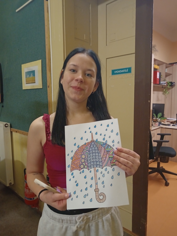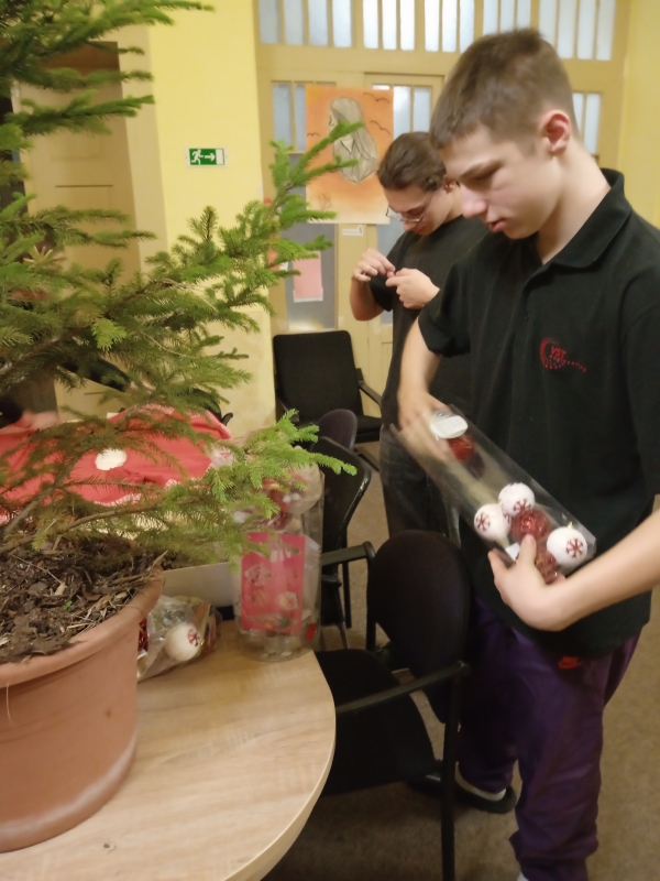 Mezi rušnými událostmi jsme si však dopřáli i klidnější chvíle – u deskových her či antistresových omalovánek. S příchodem adventu jsme se pustili do zdobení vánočního stromečku, vánočních vystřihovánek a také do úklidu výtvarných skříní, aby byl náš tvůrčí prostor opět svěží a připravený.