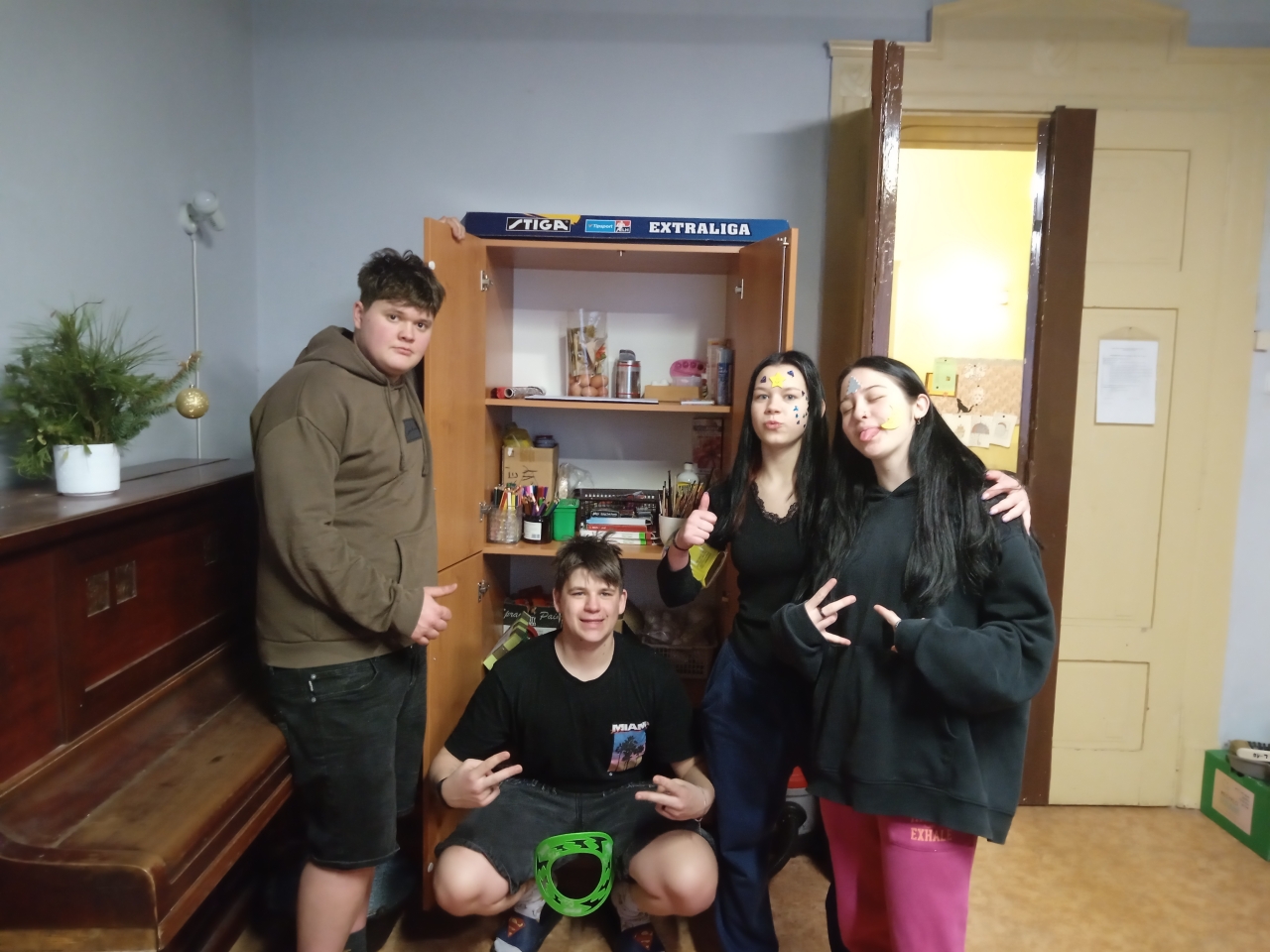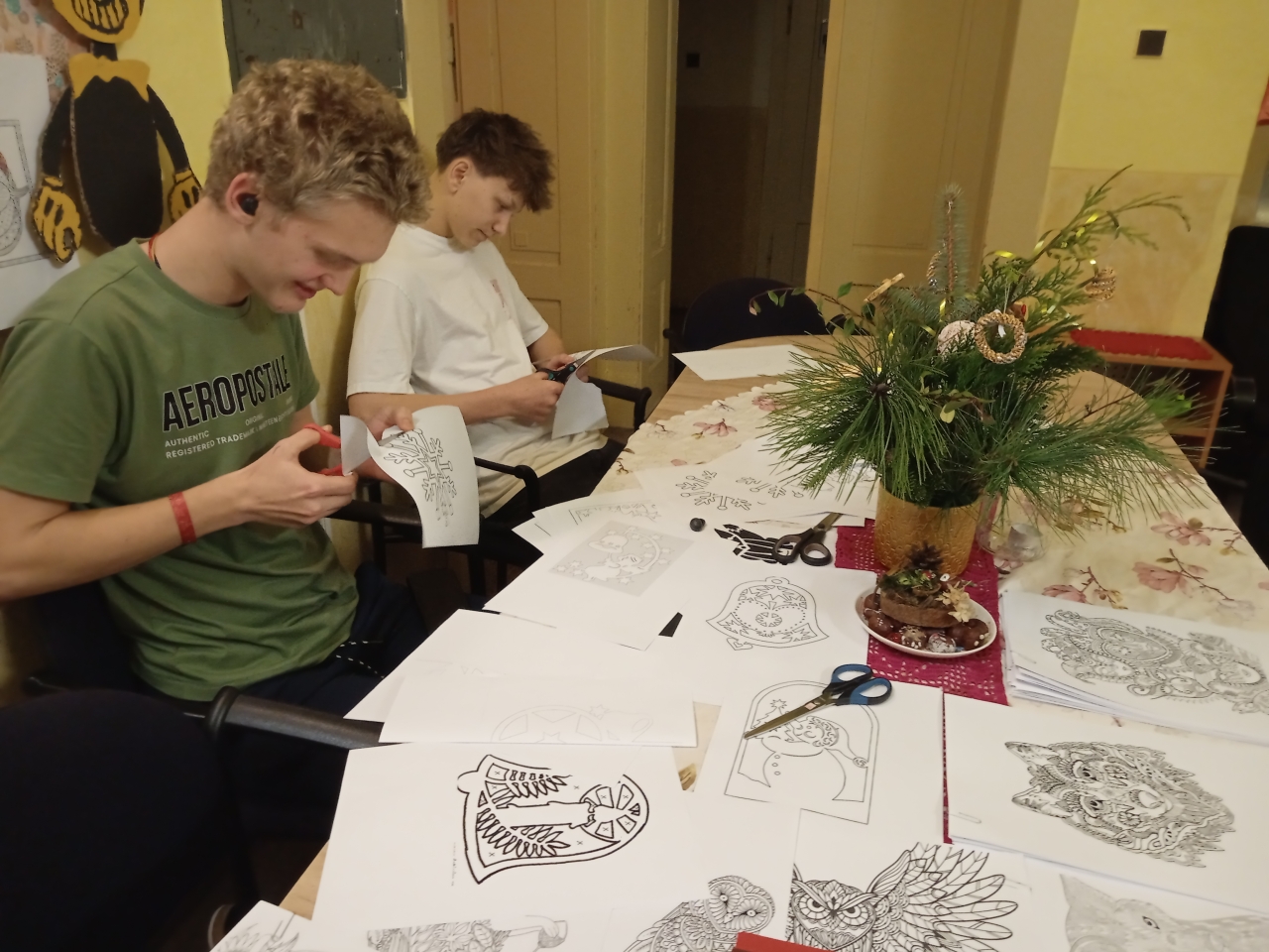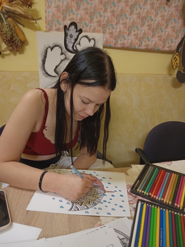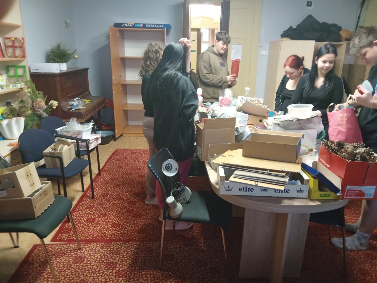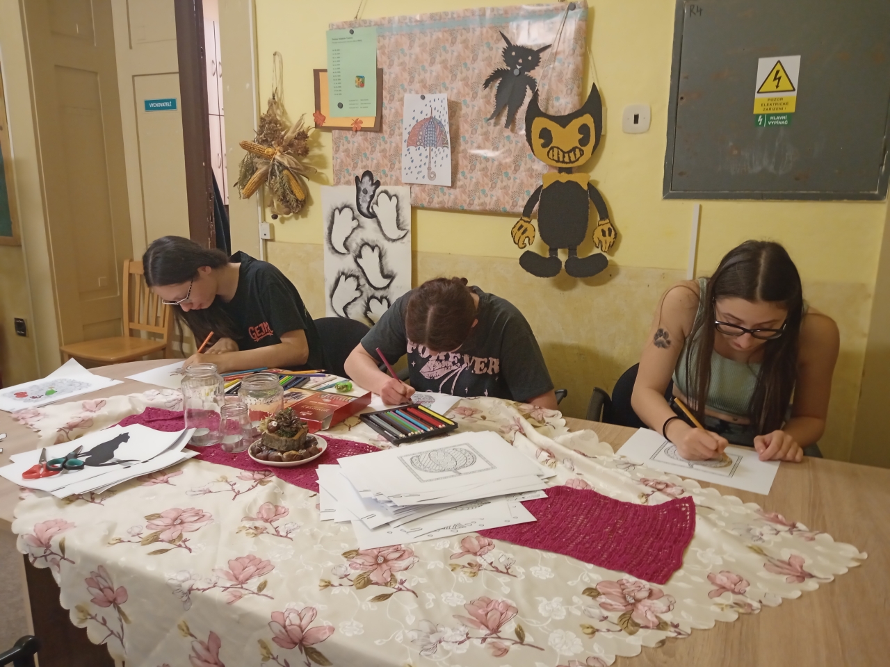 Mezi rušnými událostmi jsme si však dopřáli i klidnější chvíle – u deskových her či antistresových omalovánek. S příchodem adventu jsme se pustili do zdobení vánočního stromečku, vánočních vystřihovánek a také do úklidu výtvarných skříní, aby byl náš tvůrčí prostor opět svěží a připravený.