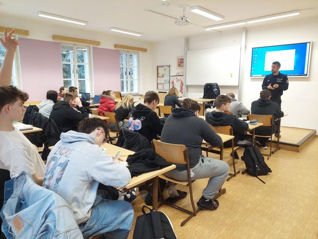 Během přednášky por. Mgr. Miroslav Mervart žákům představil vybrané pojmy trestního a přestupkového práva. Policista i žáci sdíleli své zážitky a diskutovali nejen o rizicích závislosti, ale třeba i o tom, že zákony nás chrání.